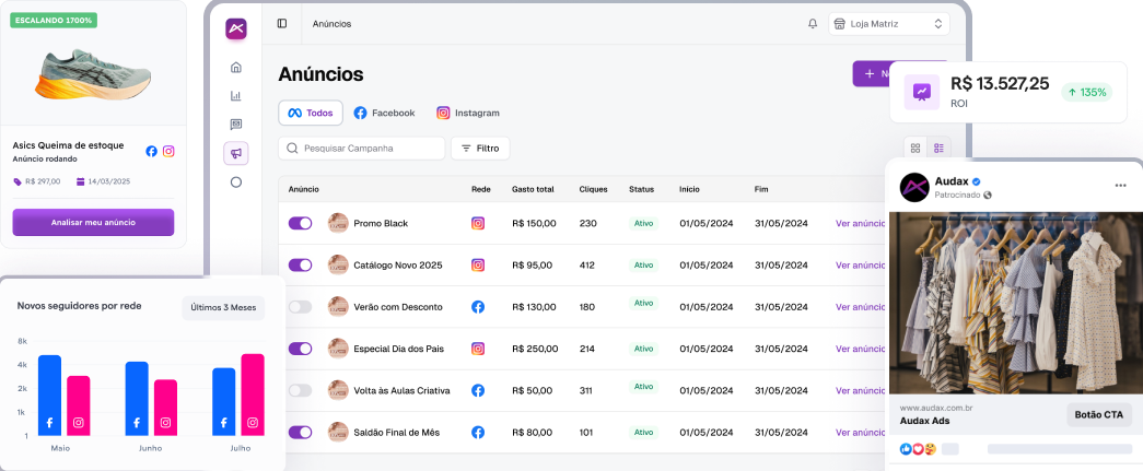 Gerencie redes sociais, anúncios e campanhas — tudo em um só lugar, feito para lojistas grande, pequenos e médio porte.